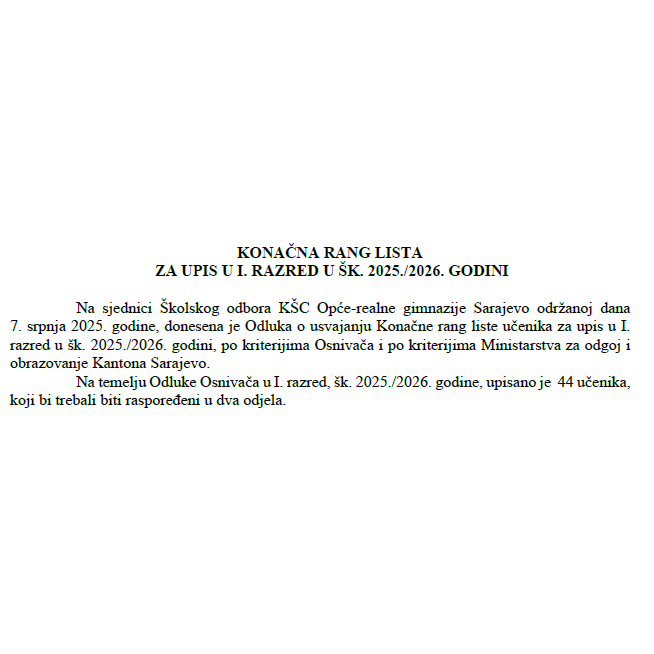 Na sjednici Školskog odbora KŠC Opće-realne gimnazije Sarajevo održanoj dana 7. srpnja 2025. godine, donesena je Odluka o usvajanju Konačne rang liste učenika za upis u I. razred u šk. 2025./2026. godini, po kriterijima Osnivača i po kriterijima Ministarstva za odgoj i obrazovanje Kantona Sarajevo. Na temelju Odluke Osnivača u I. razred, šk. 2025./2026. godine, upisano je 44 učenika, koji bi trebali biti raspoređeni u dva odjela.