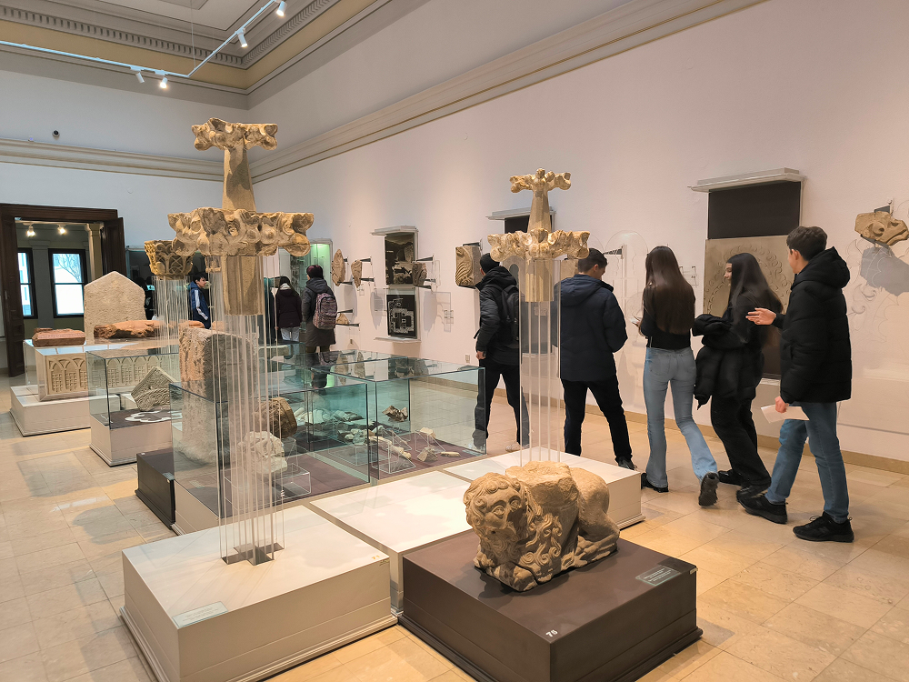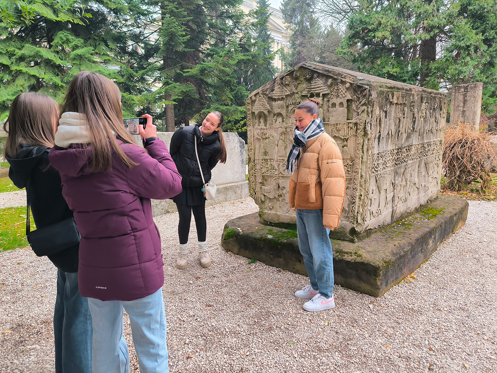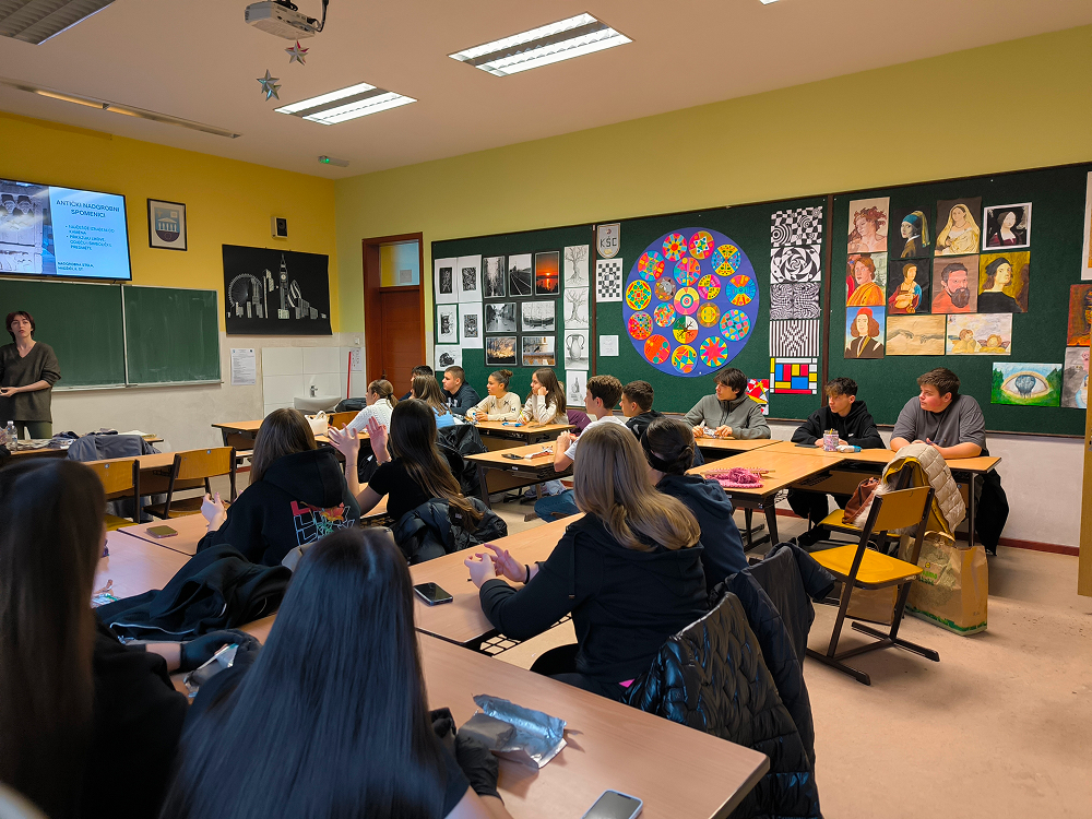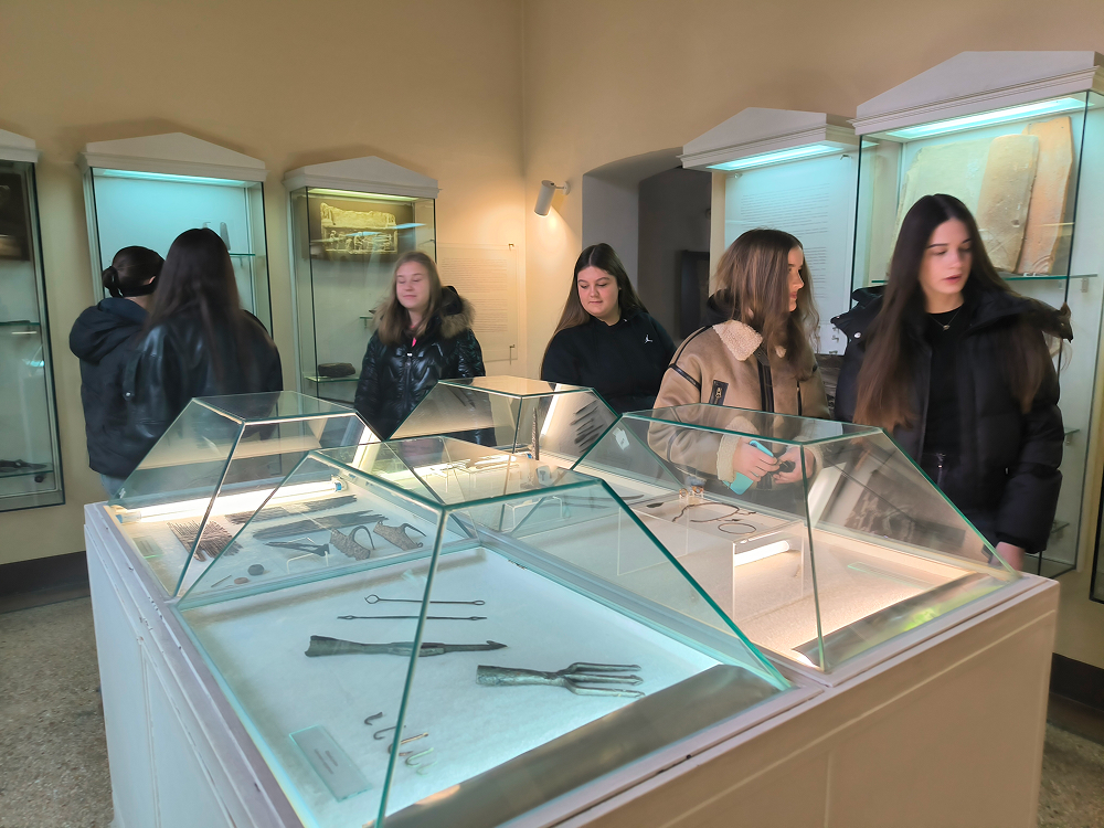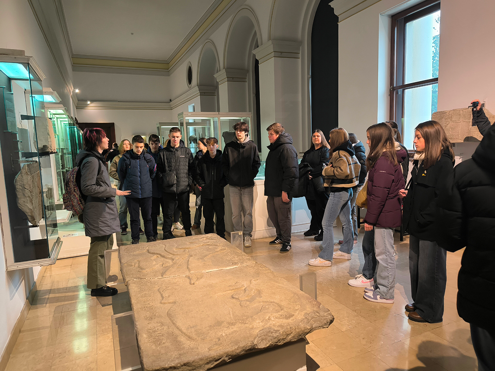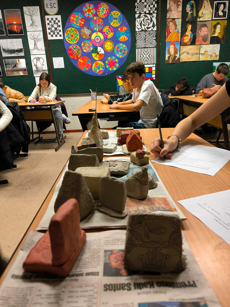 Učenici IX. e razreda, uz pratnju nastavnice Ivane Mijić Čavlović i četvero studenata Akademije likovnih umjetnosti u Sarajevu, realizirali su 10. prosinca 2025. godine nastavni dan posvećen umjetnosti starog svijeta kroz terenski i praktični rad iz predmeta Likovni odgoj. Prvi sat proveli su u Zemaljskom muzeju, gdje su, uz stručno vodstvo nastavnice i studenata, promatrali antičke i srednjovjekovne nadgrobne spomenike te stećke u botaničkom vrtu. Kroz razgovor i analizu učenici su upoznali simboliku, stilizaciju i načine izrade skulpturalnih formi karakterističnih za različita povijesna razdoblja.