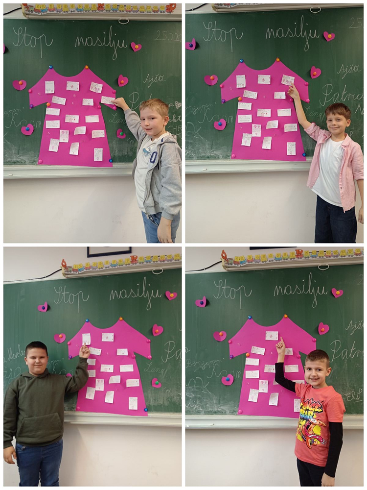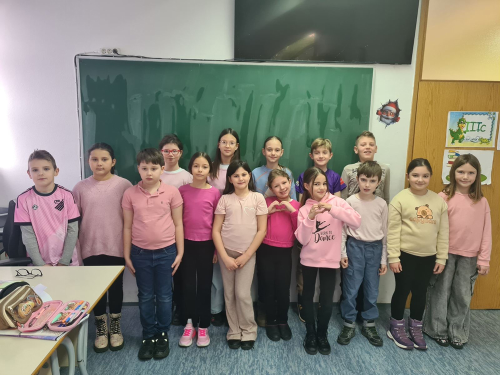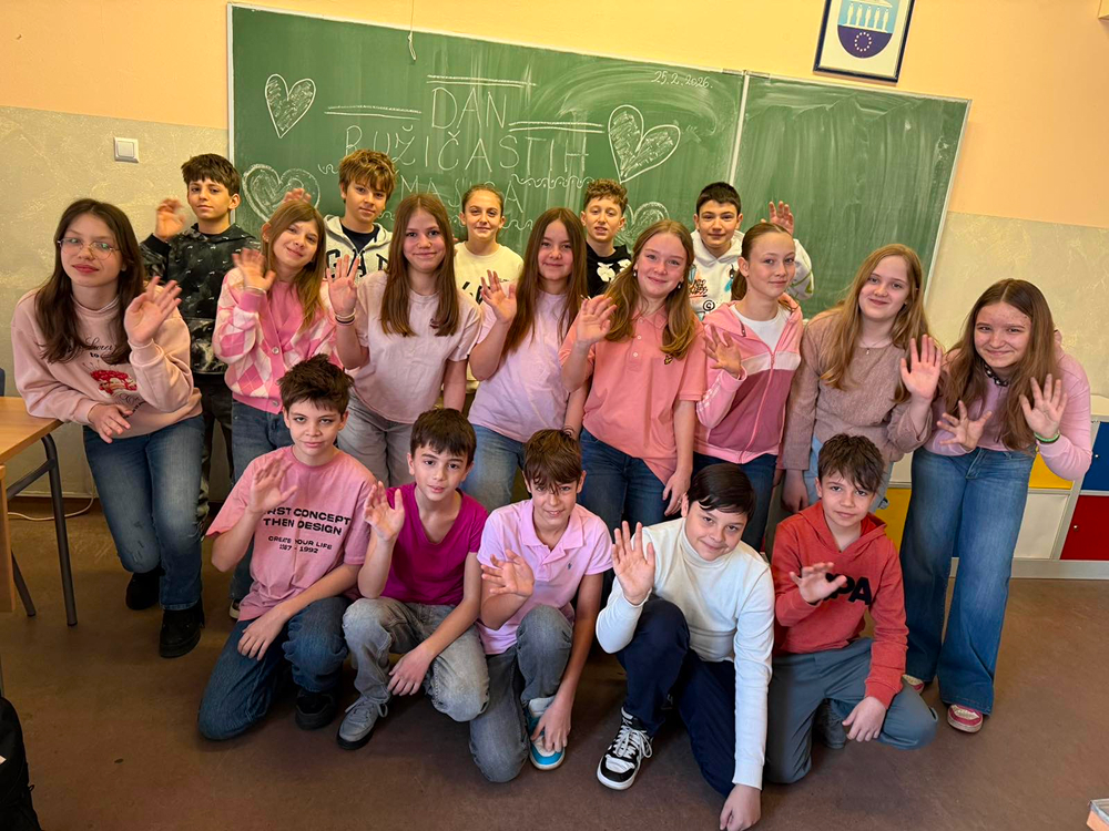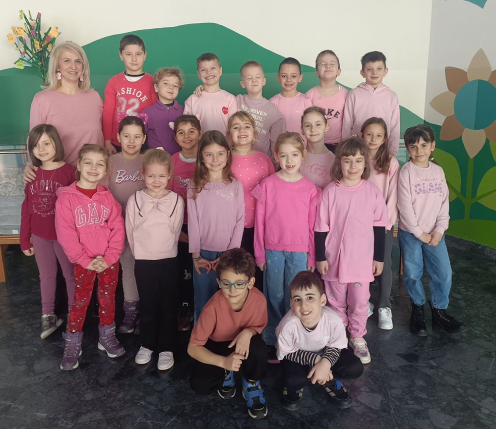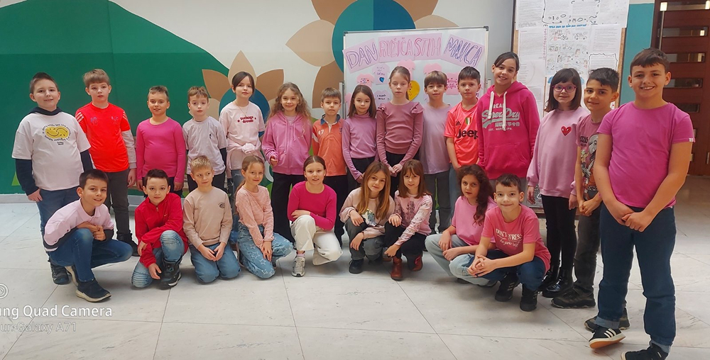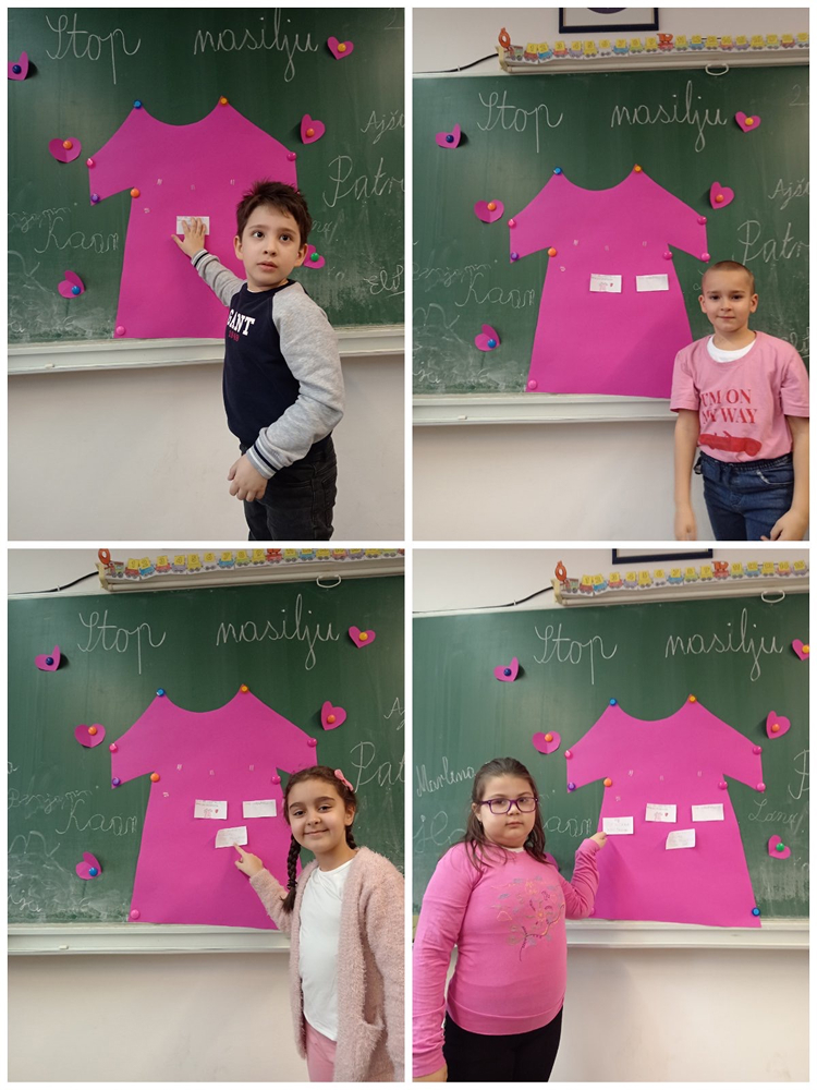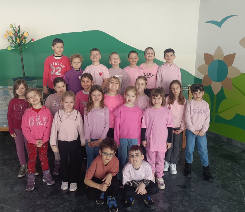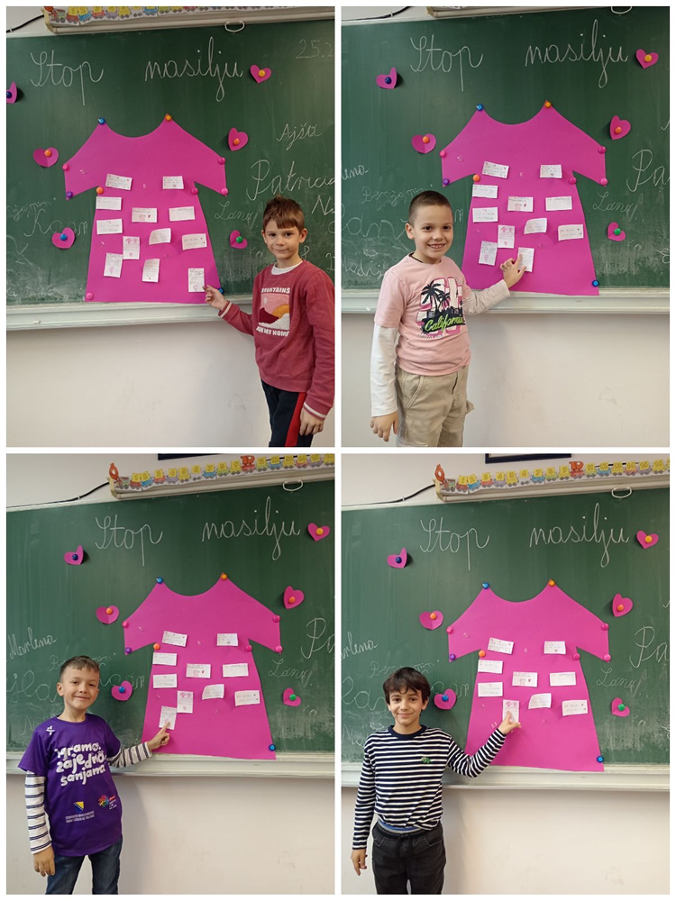 U kreativnoj radionici učenici su od ružičastog papira izrađivali male majice, pažljivo ih izrezivali i na njih ispisivali snažne poruke protiv nasilja:„Stop nasilju“ i „Biraj ljubaznost“. Svaka poruka nastala je iz dječijeg srca i iskrene želje da naš razred bude mjesto sigurnosti, osmijeha i podrške. Na Dan obilježavanja ružičastih majica u srijedu, 25. veljače 2026. godine učenici su obukli ružičaste majice kao simbol zajedništva i jasne poruke – nasilju nema mjesta među nama.