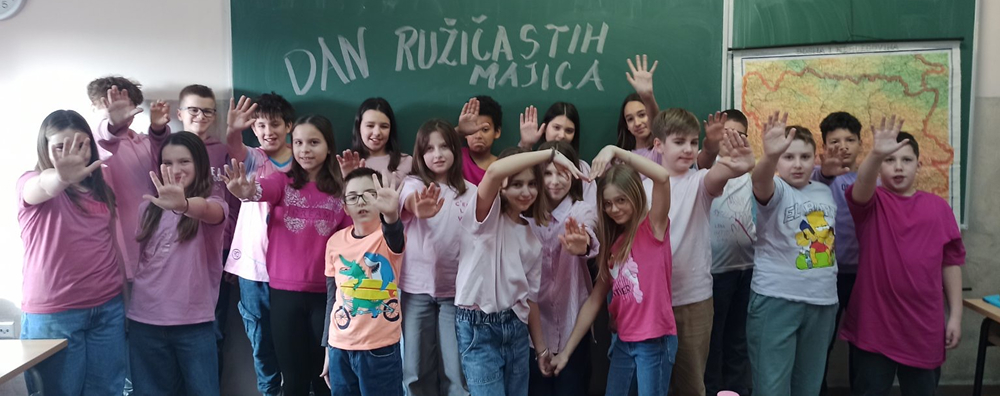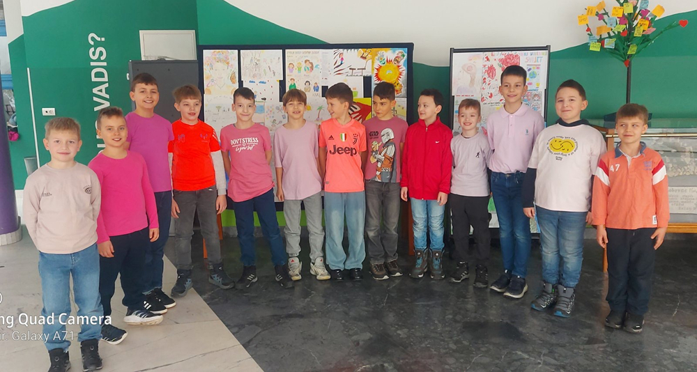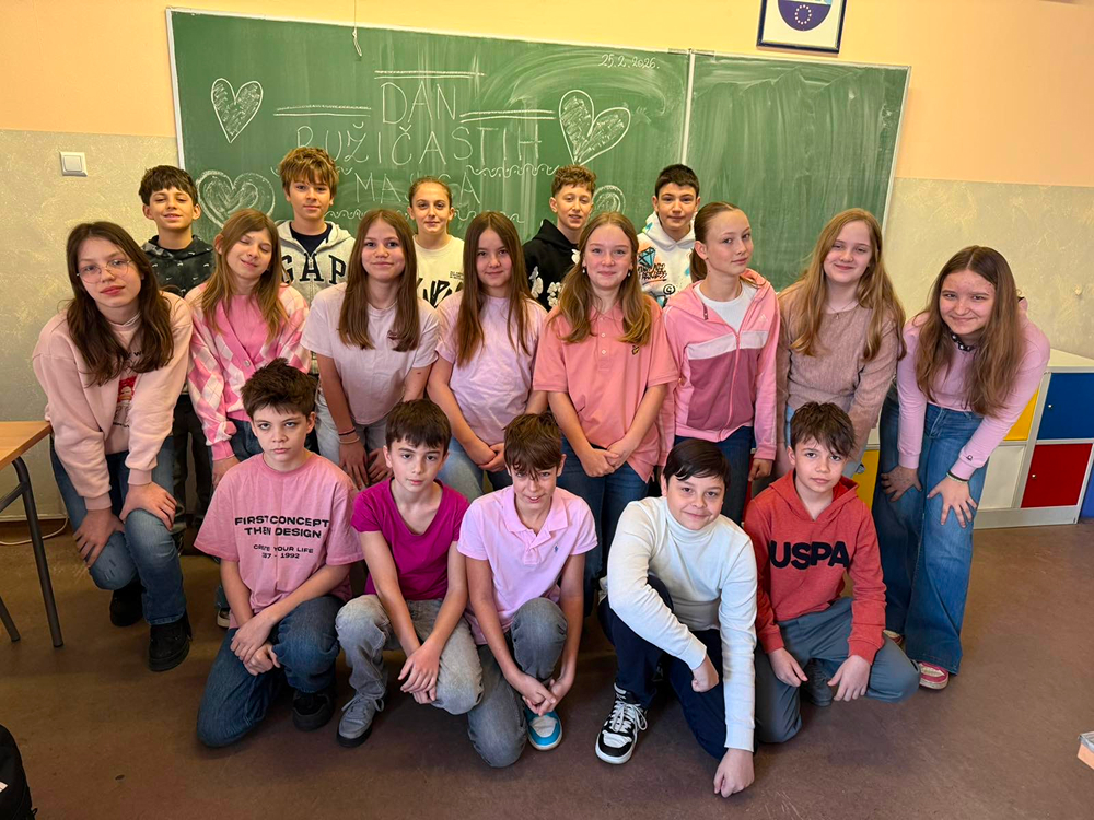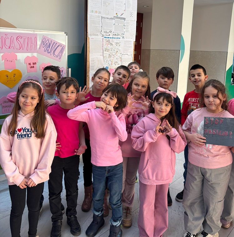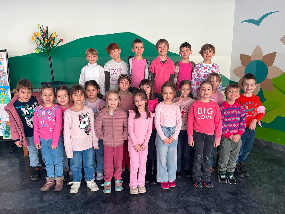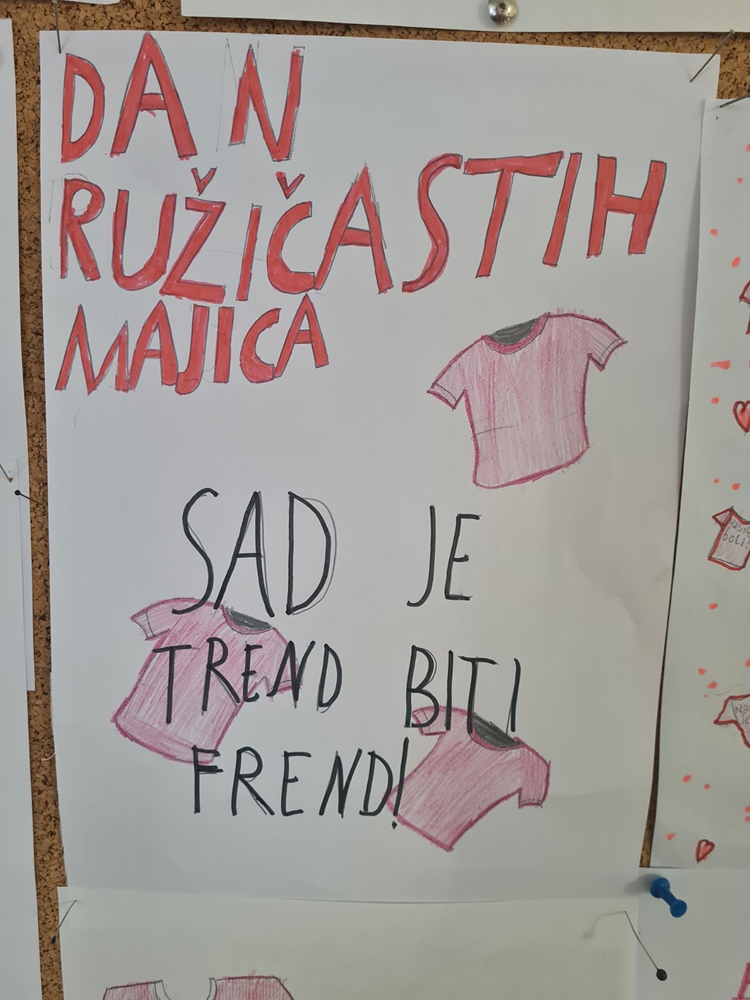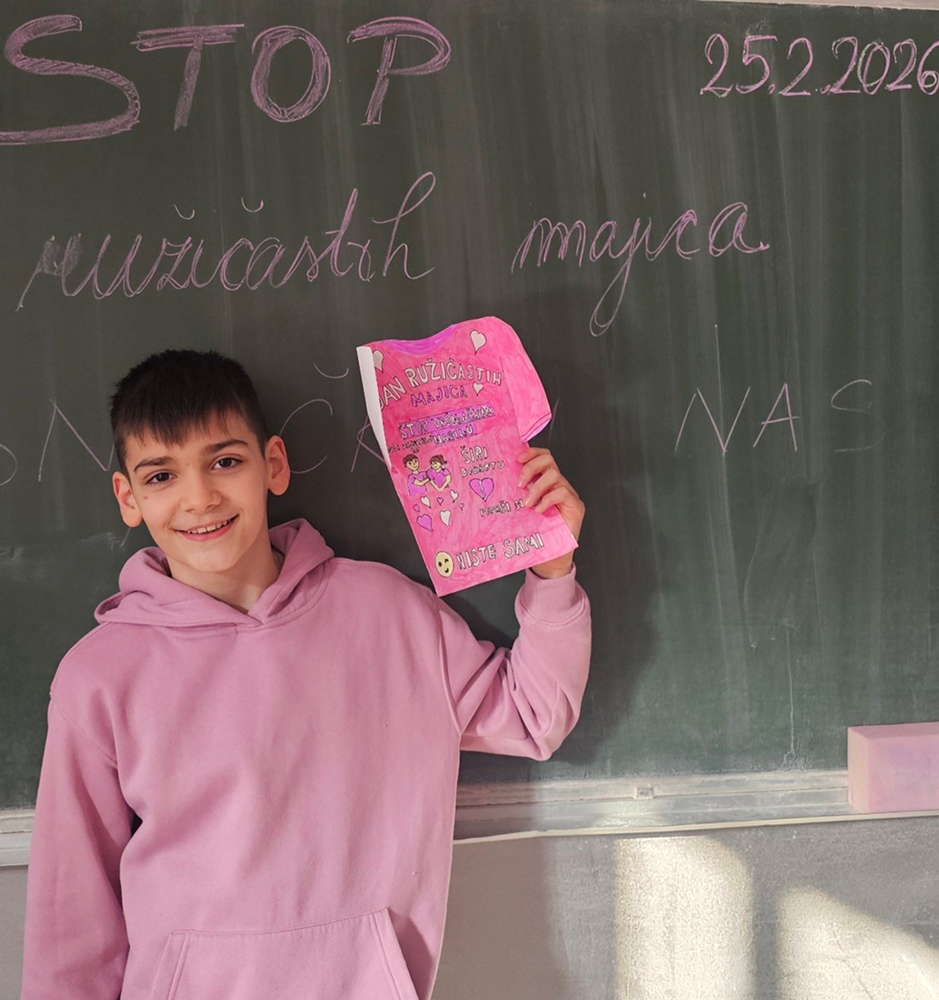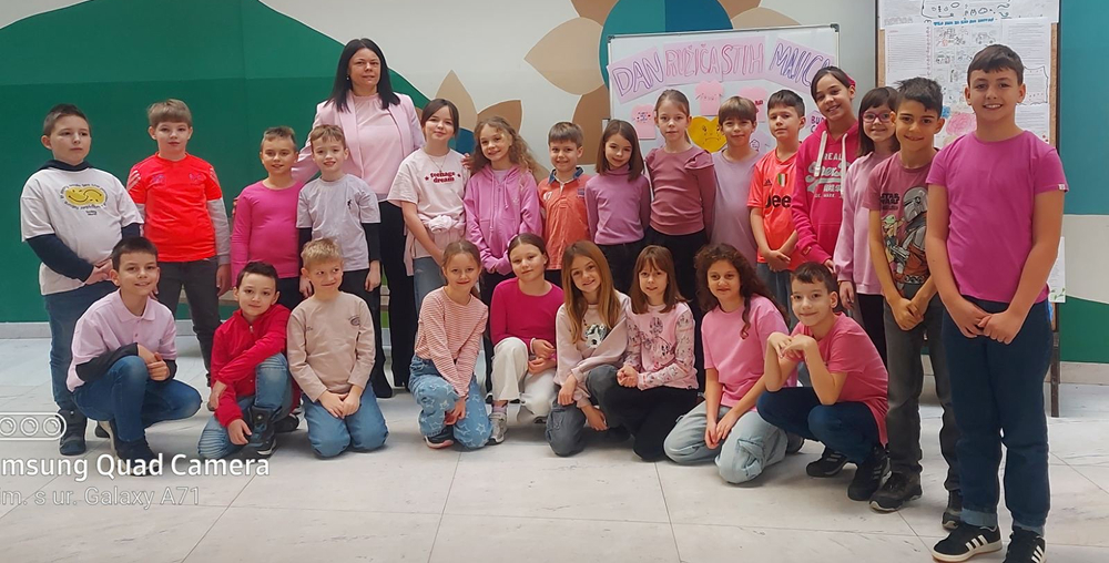 U kreativnoj radionici učenici su od ružičastog papira izrađivali male majice, pažljivo ih izrezivali i na njih ispisivali snažne poruke protiv nasilja:„Stop nasilju“ i „Biraj ljubaznost“. Svaka poruka nastala je iz dječijeg srca i iskrene želje da naš razred bude mjesto sigurnosti, osmijeha i podrške. Na Dan obilježavanja ružičastih majica u srijedu, 25. veljače 2026. godine učenici su obukli ružičaste majice kao simbol zajedništva i jasne poruke – nasilju nema mjesta među nama.