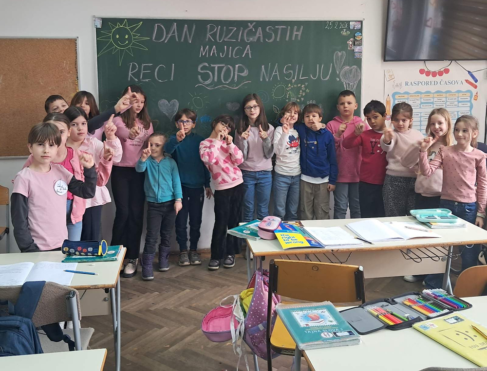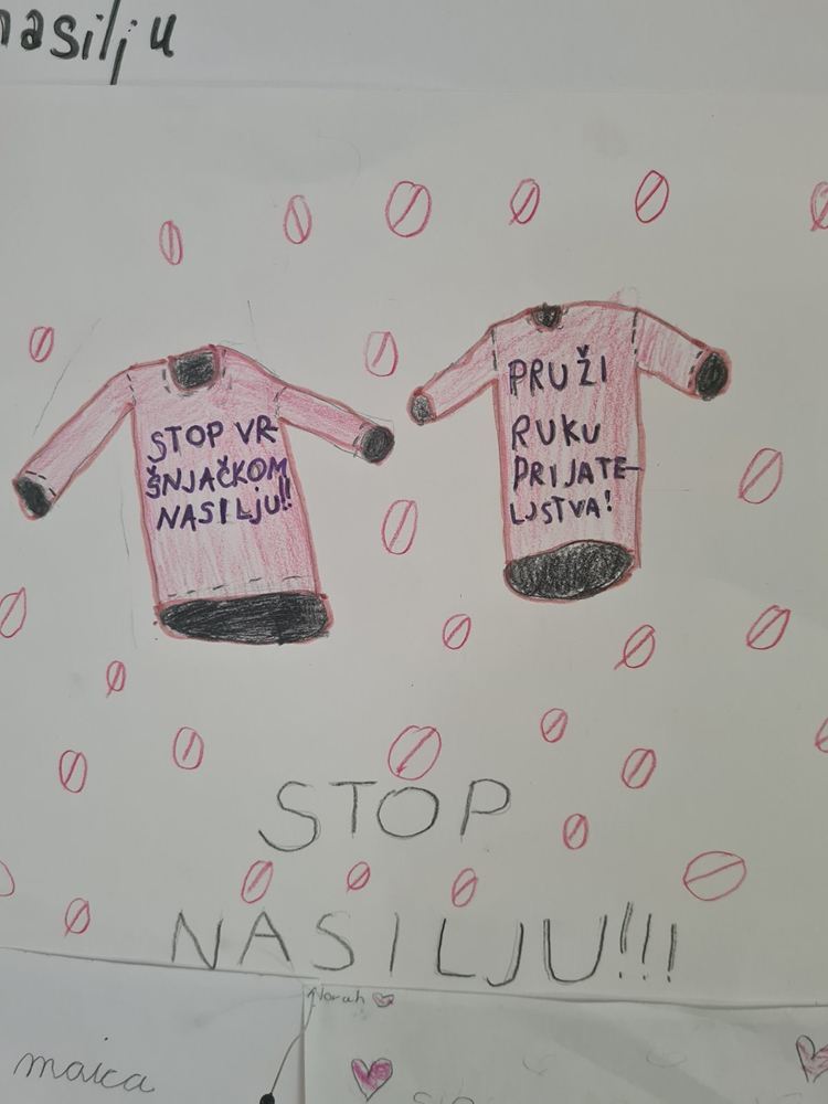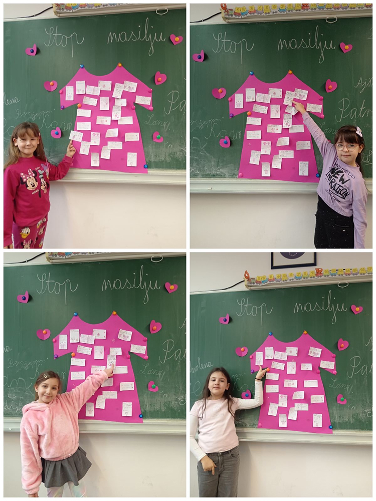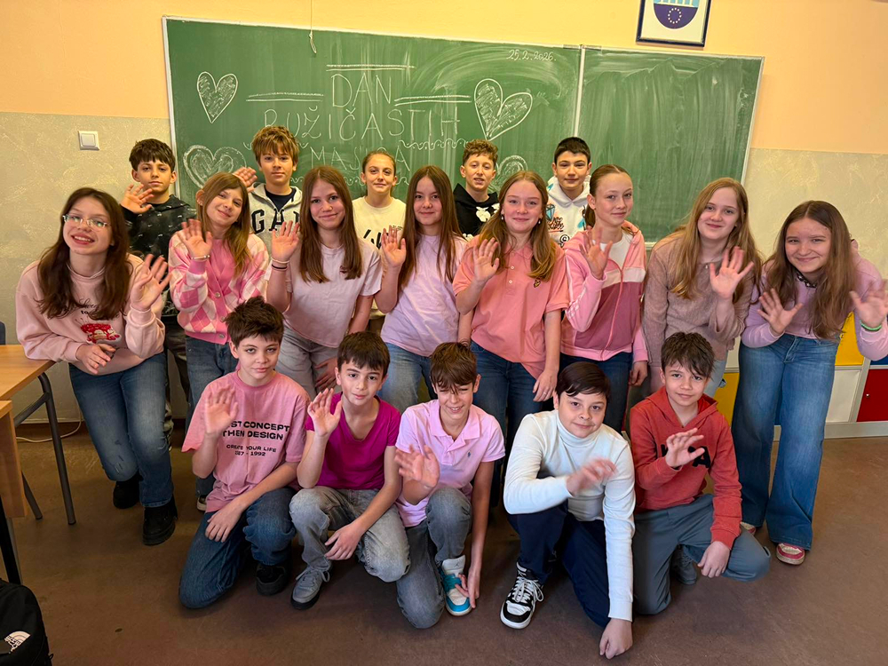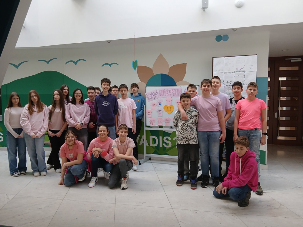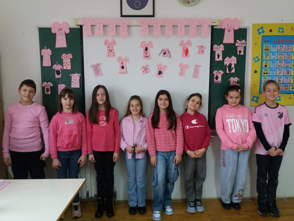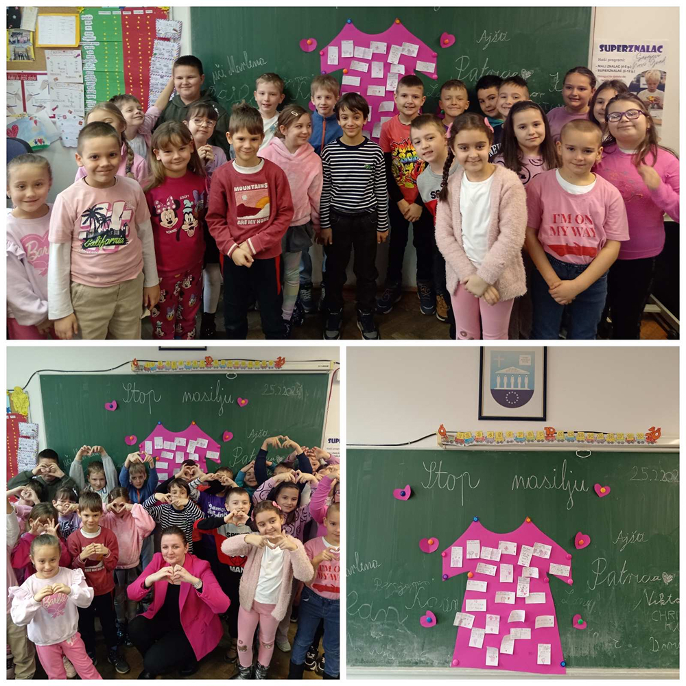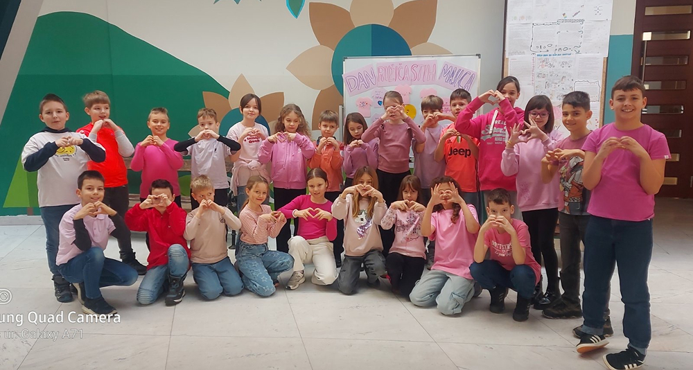 U kreativnoj radionici učenici su od ružičastog papira izrađivali male majice, pažljivo ih izrezivali i na njih ispisivali snažne poruke protiv nasilja:„Stop nasilju“ i „Biraj ljubaznost“. Svaka poruka nastala je iz dječijeg srca i iskrene želje da naš razred bude mjesto sigurnosti, osmijeha i podrške. Na Dan obilježavanja ružičastih majica u srijedu, 25. veljače 2026. godine učenici su obukli ružičaste majice kao simbol zajedništva i jasne poruke – nasilju nema mjesta među nama.