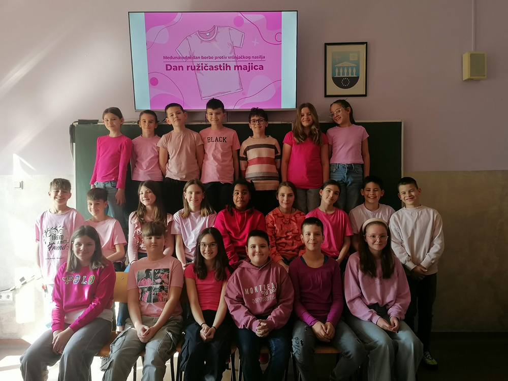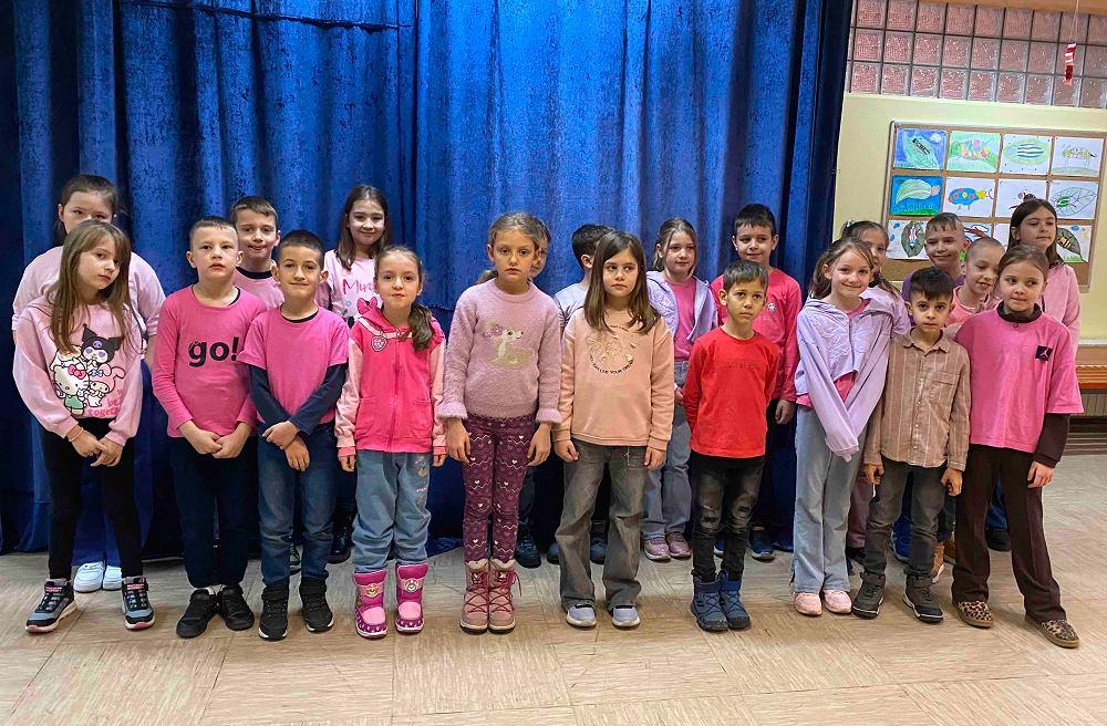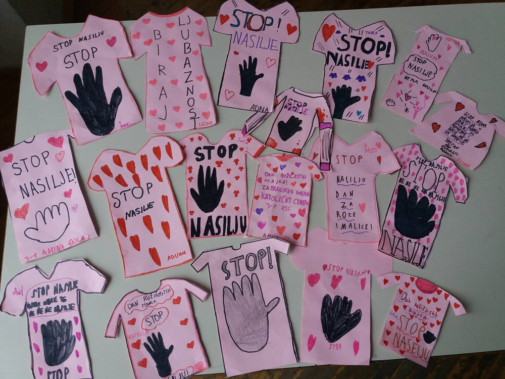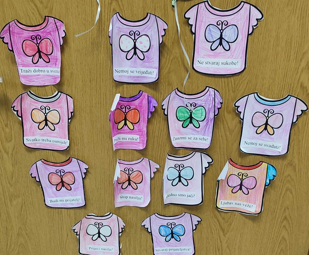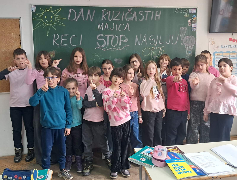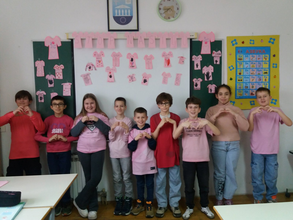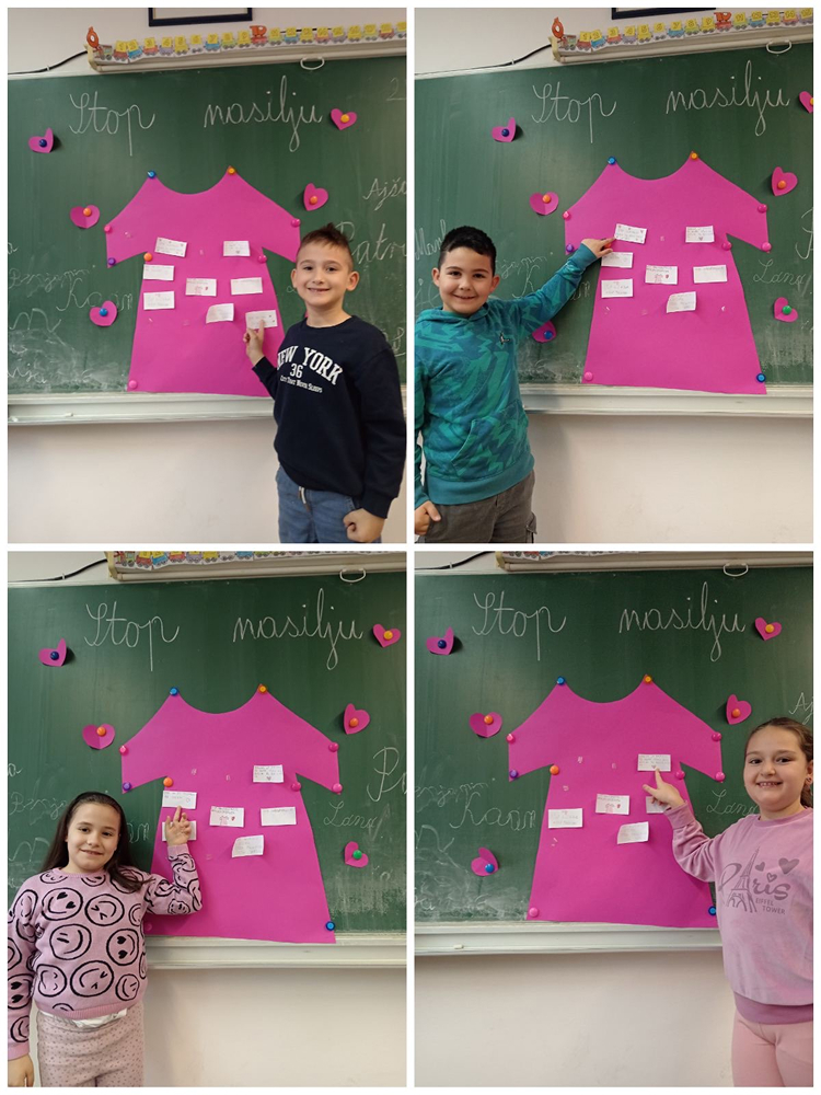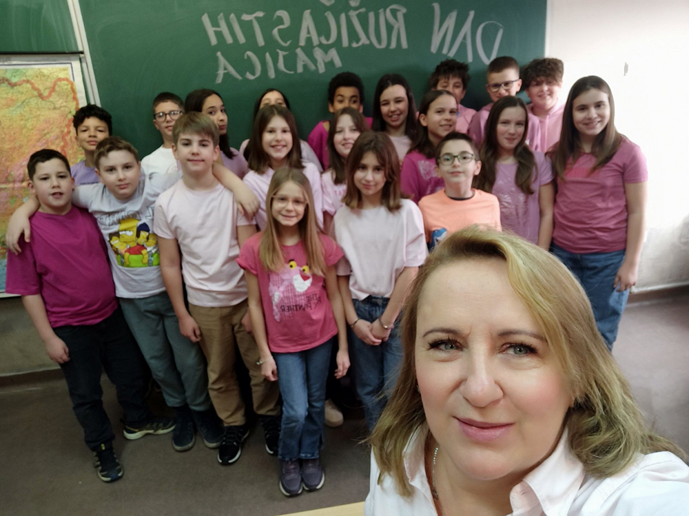 U kreativnoj radionici učenici su od ružičastog papira izrađivali male majice, pažljivo ih izrezivali i na njih ispisivali snažne poruke protiv nasilja:„Stop nasilju“ i „Biraj ljubaznost“. Svaka poruka nastala je iz dječijeg srca i iskrene želje da naš razred bude mjesto sigurnosti, osmijeha i podrške. Na Dan obilježavanja ružičastih majica u srijedu, 25. veljače 2026. godine učenici su obukli ružičaste majice kao simbol zajedništva i jasne poruke – nasilju nema mjesta među nama.