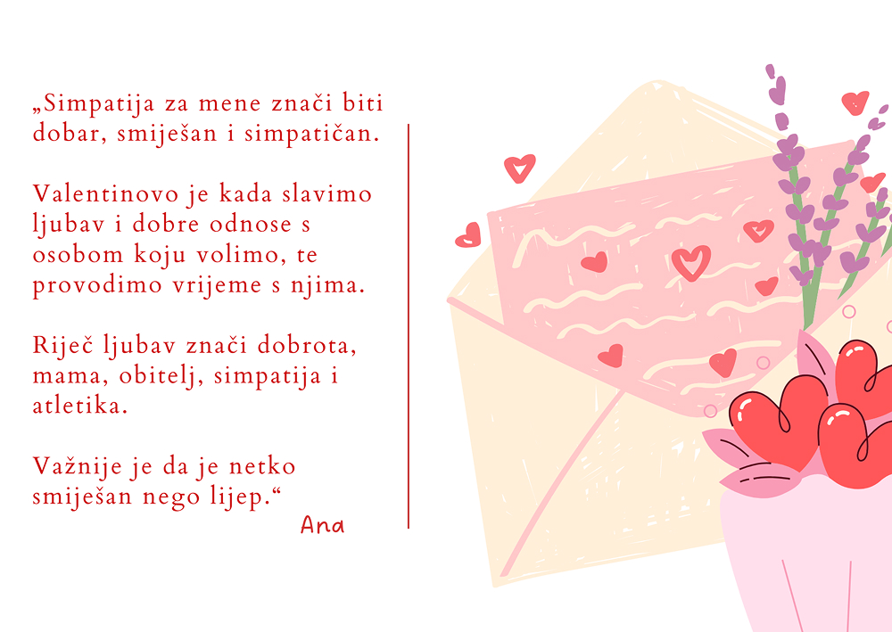Ljubav je jedna od najljepših i najvažnijih stvari u životu svakog čovjeka. Ne znači samo zaljubljenost, nego i prijateljstvo, poštovanje, pomaganje i brigu za druge. Valentinovo, koje se slavi 14 . veljače, to je dan kada se posebno prisjećamo koliko je važno pokazivati ljubav ljudima oko sebe – obitelji, prijateljima i svima koji nam nešto znače. Tim povodom pitali smo učenike 6. D razreda da nam napišu što za njih znači Valentinovo. Njihove misli su iskrene, tople i pokazuju kako djeca vide ljubav na svoj način.