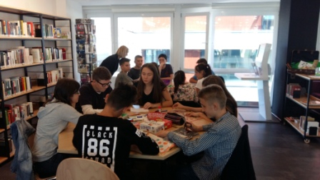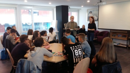 U ponedjeljak, 16. listopada, učenici su zajedno s nastavnicama Natašom Mandić i Sanjom Portner posjetili Goethe-Institut, gdje su ih dočekali književnik Mirsad Bećirbašić i osoblje Goethe-Instituta. Prva radionica bila je posvećena ljepoti riječi i njezinoj stvaralačkoj moći. Učenici su pozorno slušali pjesnika M. Bećirbašića, potom promišljali i komentirali misli poznatih književnika koje su oni izrekli o knjizi, a na kraju čitali i vlastite stihove posvećene ljepoti i šarenilu jeseni. Druga radionica iz njemačkoga jezika tematski se nastavila na prethodnu. Učenici su dobili zadatak da u grupama od ponuđenog materijala osmisle, urede i prezentiraju svoje knjige.