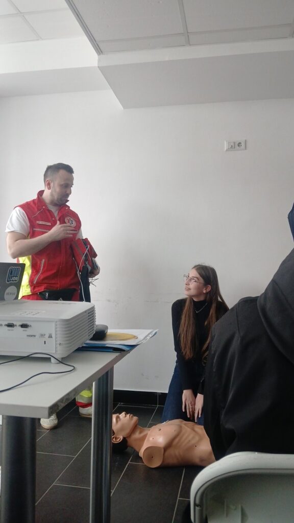 Poseban dio programa bio je posvećen hitnoj medicinskoj pomoći, gdje su tehničar i doktor urgentne medicine demonstrirali osnovne postupke pružanja prve pomoći, s naglaskom na kardiopulmonalnu reanimaciju (CPR). Naša učenica Alma Turbić aktivno je učestvovala u demonstraciji i uspješno izvela postupak CPR-a, za što je dobila brojne pohvale. Ovaj trenutak bio je izuzetno značajan za sve nas, jer smo mogli vidjeti koliko su znanje i praksa koje stičemo u školi važni i primjenjivi u stvarnim situacijama.