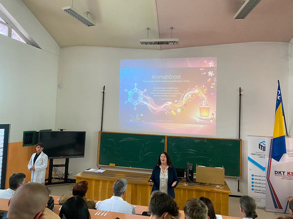 U prvom dijelu predavanja, koje je održala prof. dr. Amira Čopra-Janićijević, govorilo se o strukturi i imenovanju aromatskih spojeva, pri čemu su naši učenici mogli ponoviti već naučeno te proširiti svoja znanja o značaju aroma u svakodnevnom životu.