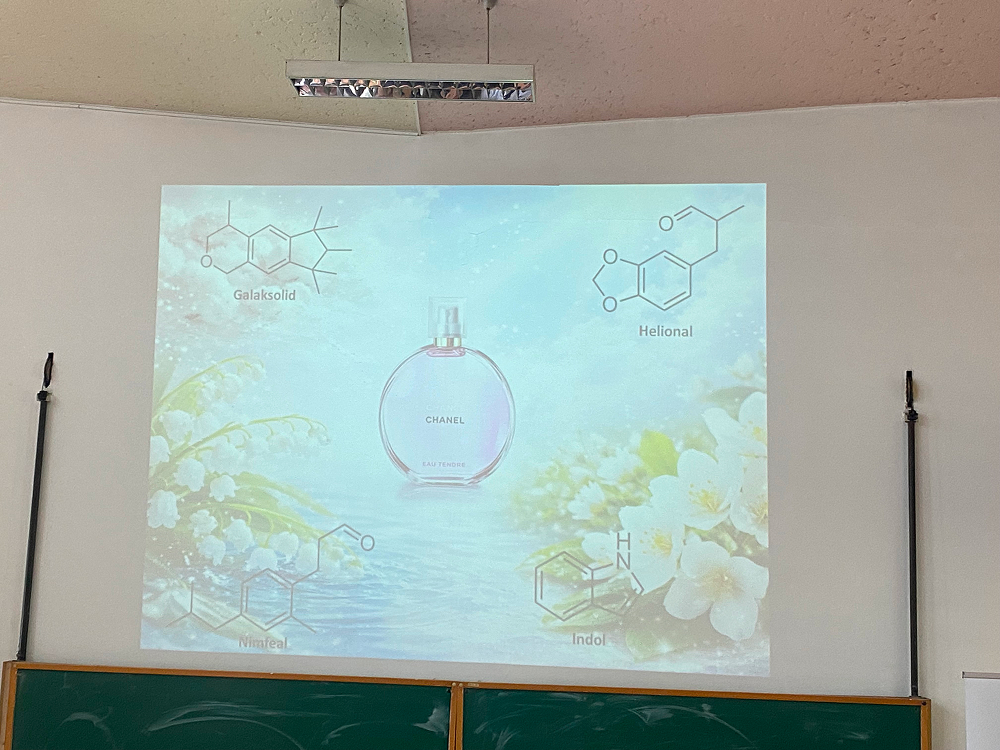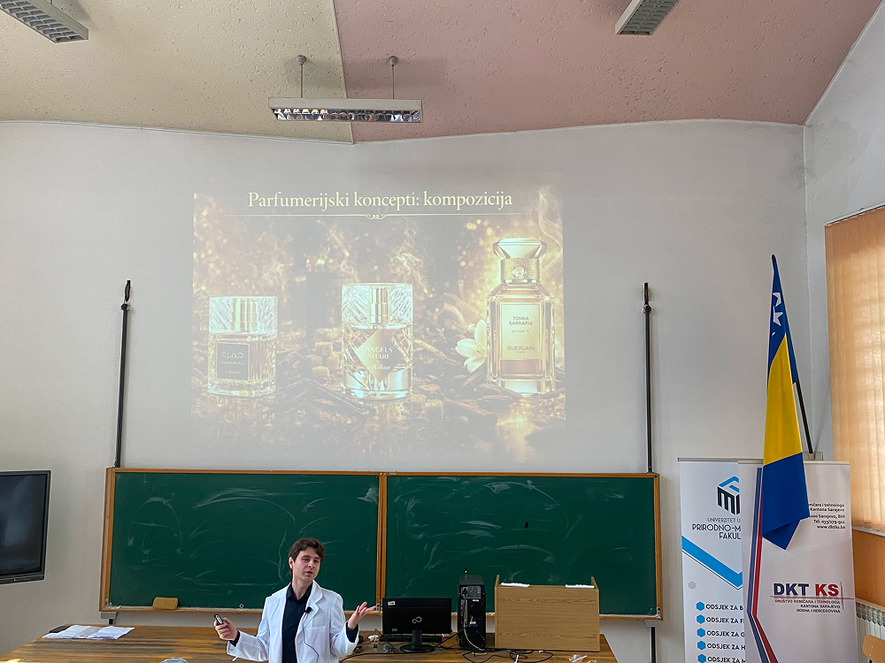 Drugi dio predavanja, koji je vodio mr. Enis Šuta, bio je posebno zanimljiv cjelokupnom auditoriju, kao i našim učenicima. Kroz konkretne primjere predstavljena je praktična primjena aromatskih spojeva, s posebnim naglaskom na industriju parfema. Na vrlo zanimljiv način objasnio je koncepte proizvodnje parfema te povezao nacrt strukture sa simfonijom mirisa.