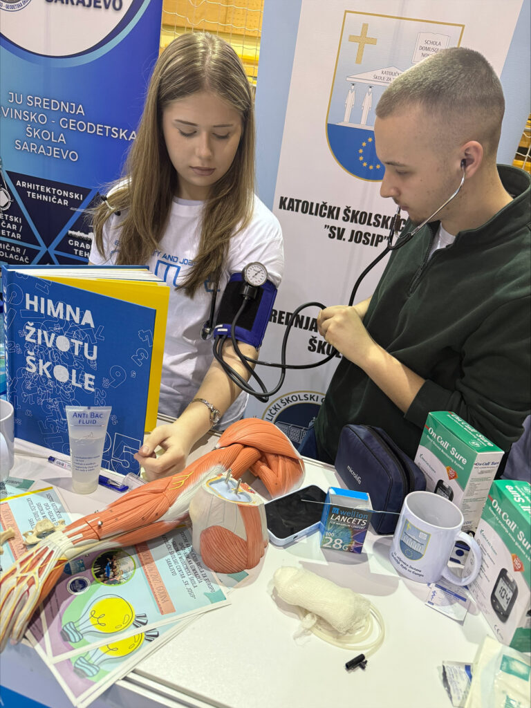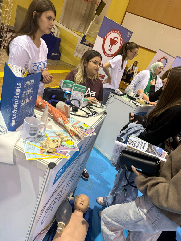 Na našem štandu bili su izloženi promotivni letci, te najčešći rekviziti koji se koriste u medicinskoj struci. Posjetiteljima smo predstavili obrazovne smjerove koje naša škola nudi: medicinska sestra/tehničar i fizioterapeutski tehničar, oba u četvrtom stupnju obrazovanja.