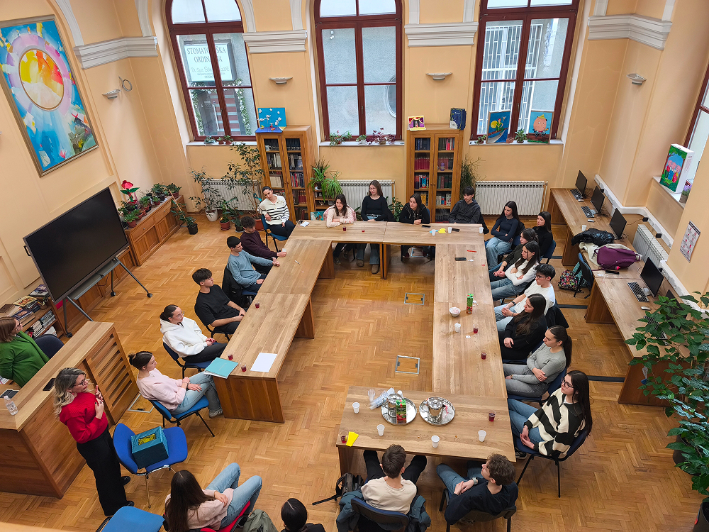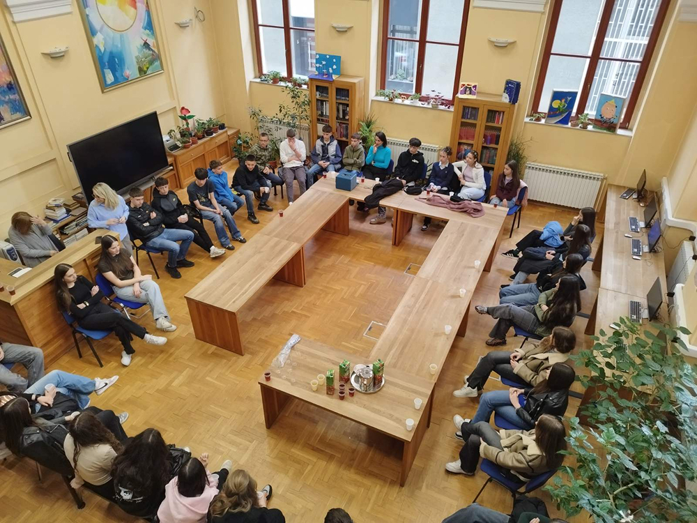 Nakon sudjelovanja na nastavnom satu u školskoj knjižnici, Marina Pregernik, direktorica škole, pozdravila je prisutne učenike te iskazala zadovoljstvo pokazanim interesom i dolaskom. Upriličen je interaktivni razgovor s predstavnicima Vijeća učenika, koji su govorili o svojim iskustvima srednjoškolskog školovanja. Učenici devetih razreda su imali konkretna i jasna pitanja kroz koja su pokazivali interes za nastavne predmete, načine podučavanja, izvannastavne aktivnosti, ali i bojazan o zahtjevnosti praćenja gimnazijskog plana i programa. Predstavnici Vijeća učenika su kroz svoja iskustva ohrabrili učenike, pružili im potrebne informacije oko organizacije učenja i savladavanja nastavnog gradiva te odgovorili na pitanja koja se odnose na izvannastavne aktivnosti, projekte i teškoće s kojima su se susretali na prijelazu iz osnovne u srednju školu.