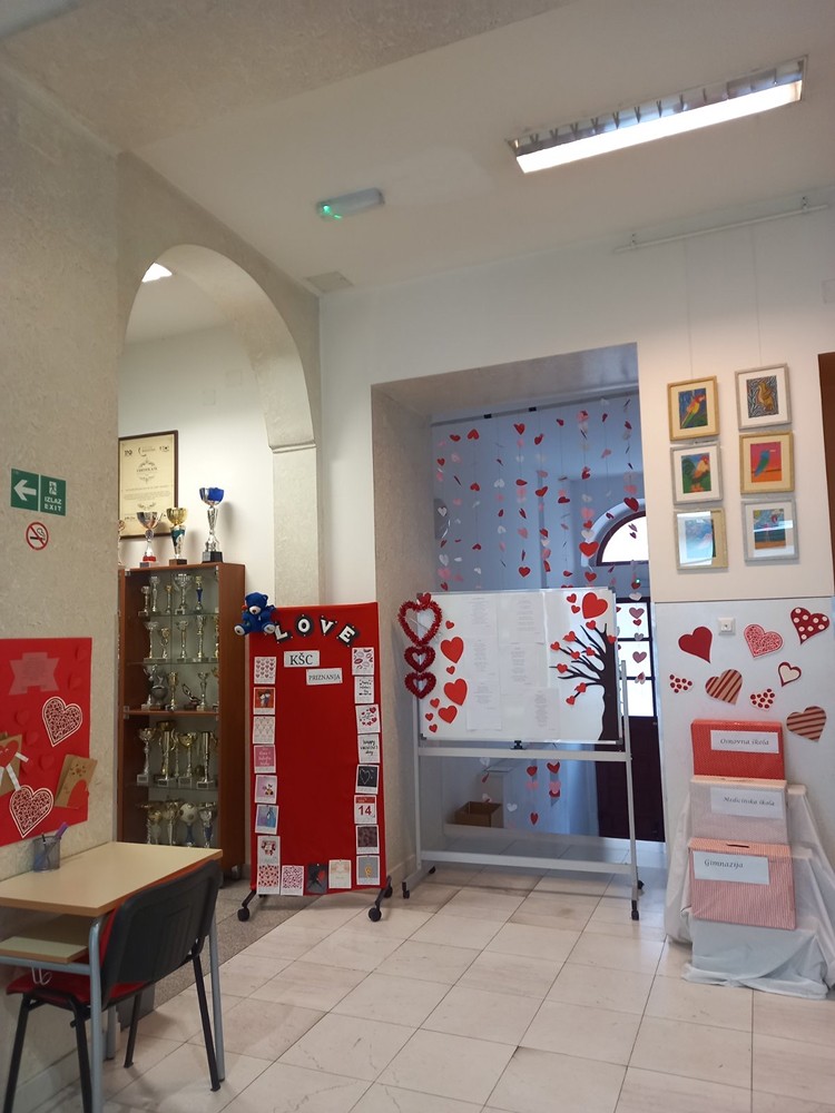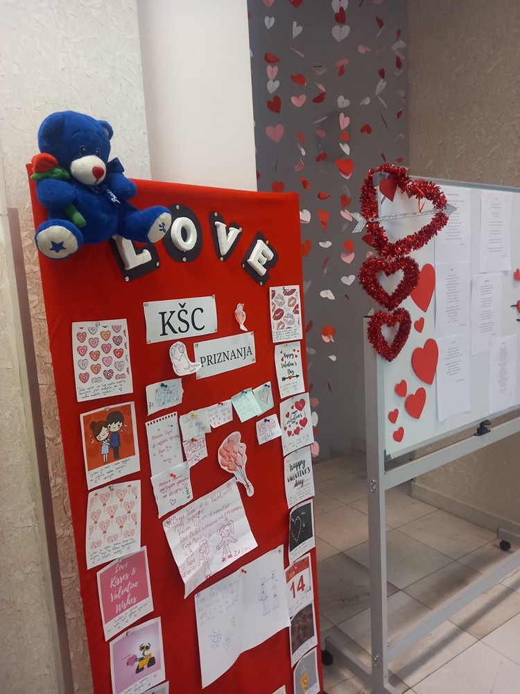 Dana 14. veljače je u našoj školi kao i svake godine obilježeno Valentinovo. Valentinovo je dan povezan s ljubavlju i romantikom te se ljubav slavi u svim oblicima, bilo da je riječ o romantičnoj ljubavi, obiteljskoj ljubavi ili pak o prijateljstvu. U holu škole su cijeli tjedan bile postavljene kutije u koje su učenici mogli stavljati anonimna ili čak potpisana ljubavna pisma. I ove godine se u kutijama pronašao veliki broj pisama koja su pronašla put do svojih primatelja. Učenici Osnovne škole su aktivno sudjelovali u izradi panoa koji su bili ispunjeni brojnim ljubavnim porukama. Također, na dan Valentinova, Vijeće učenika je ulazilo u svaki razred te su dijelili lizalice u obliku srca kao i narukvice s tri različita natpisa i u različitim bojama (ZAUZET/A – crvena boja, KOMPLICIRANO – žuta boja i SINGLE – zelena boja).