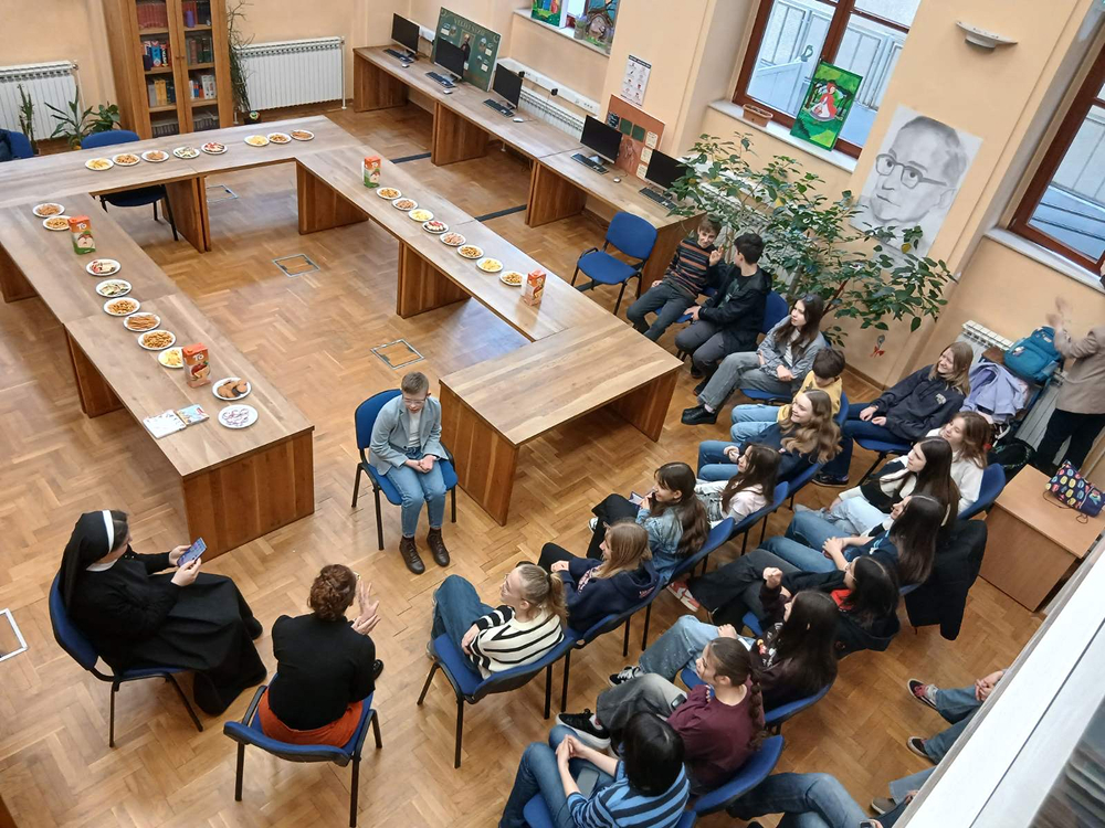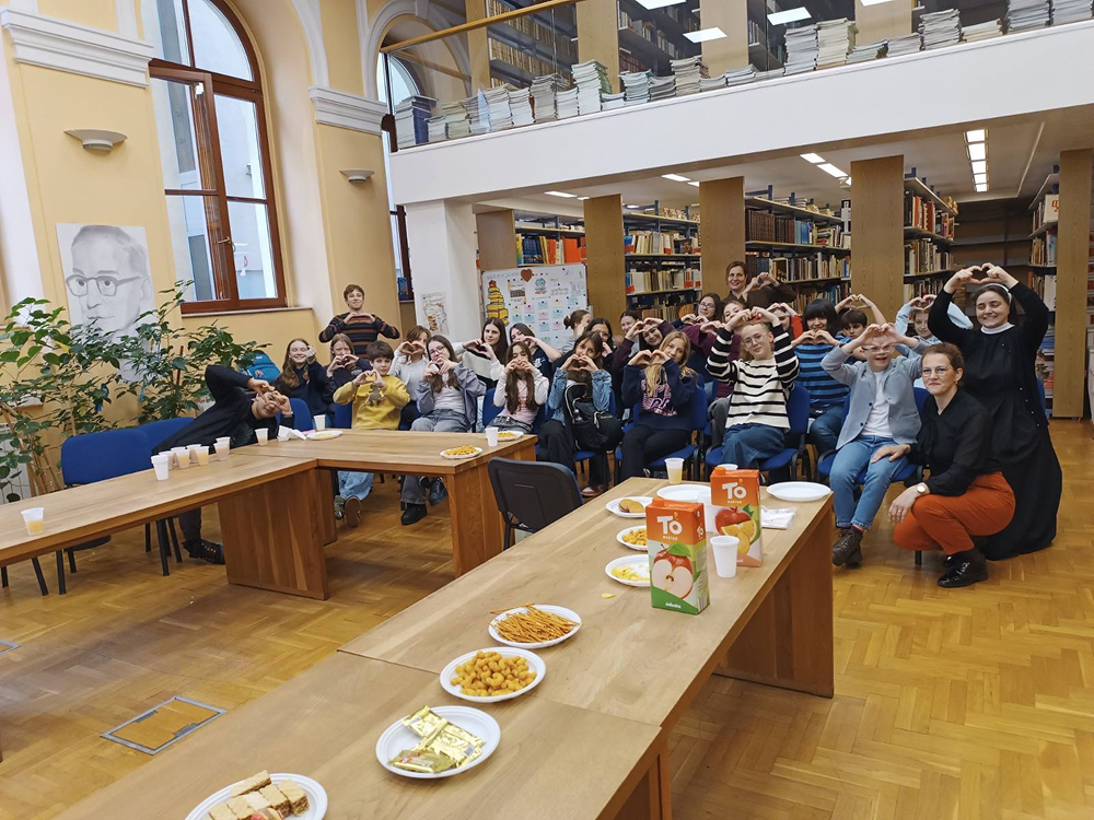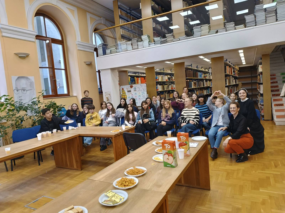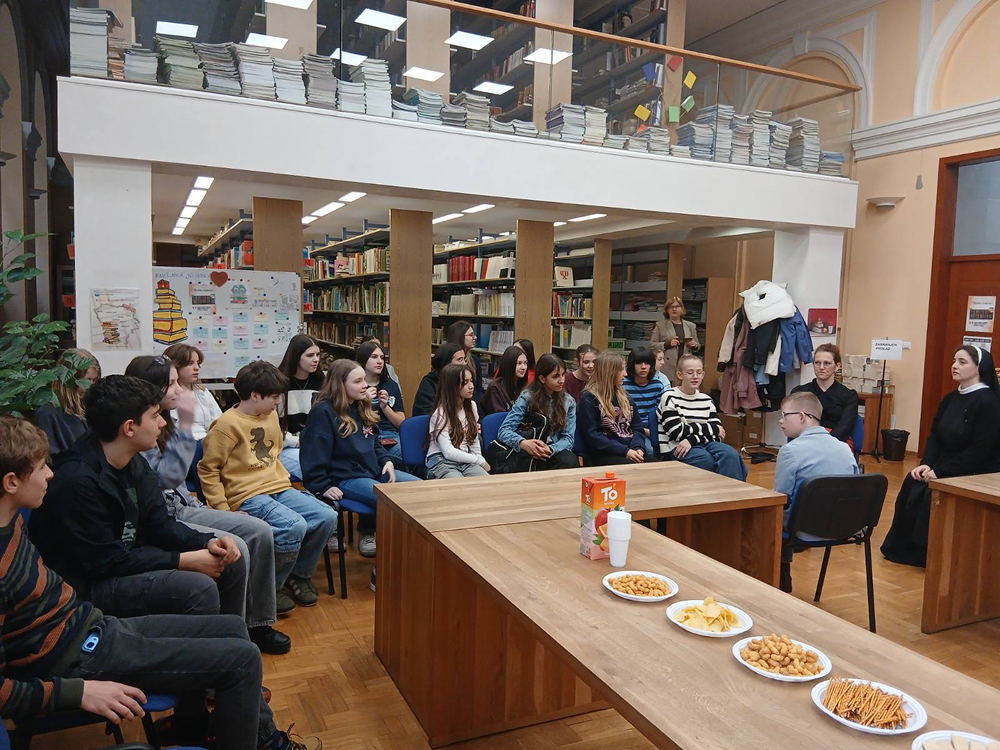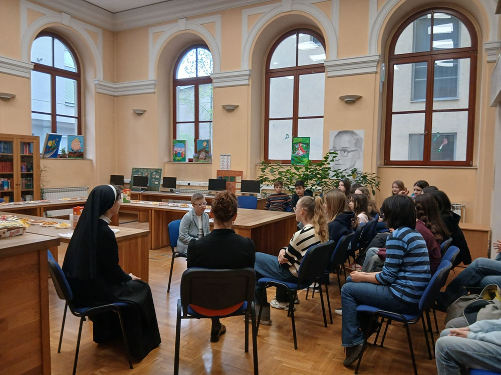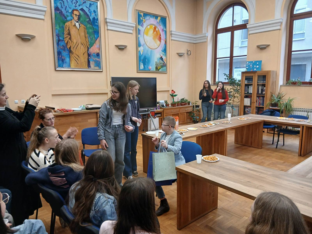 U mirnom i poticajnom okruženju naše školske knjižnice, uz gostoprimstvo naše knjižničarke Gordane, u utorak, 21. travnja 2026. g., održano je druženje koje će učenici Novinarske sekcije i Novinarsko-volonterske sekcije i njihove voditeljice Nataša Kelić i s. Ivana Jurišin još dugo pamtiti. Ugostili smo posebnoga gosta, dječaka predivnoga osmijeha i predivnoga srca – Husejna Šabanovića, učenika šestoga razreda Osnovne škole ,,Fatima Gunić“, koji je u pratnji svoje majke Amre Šabanović podijelio s nama djelić svoga svijeta.