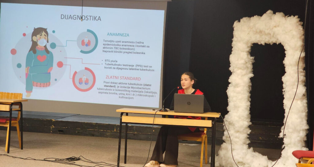 U okviru aktivnosti obilježavanja Svjetskog dana borbe protiv tuberkuloze 24. 3. 2026., učenica Taida Imamović, 3.a razreda KŠC Srednje medicinske škole, realizirala je edukativno predavanje za učenike prvih razreda KŠC Srednje medicinske škole u auditoriju škole.