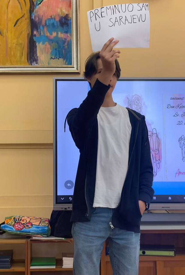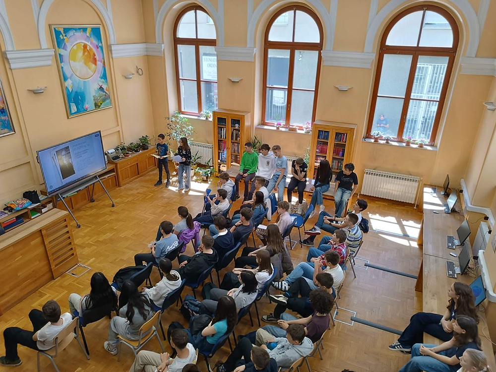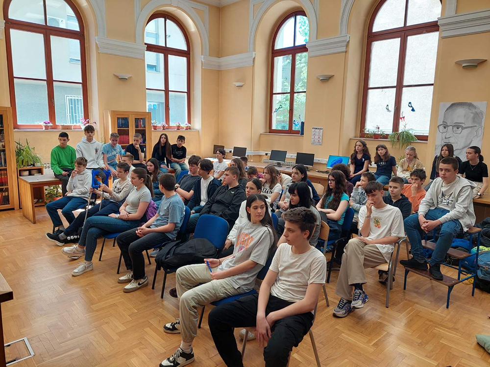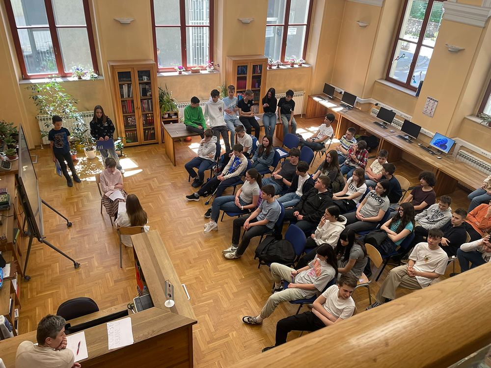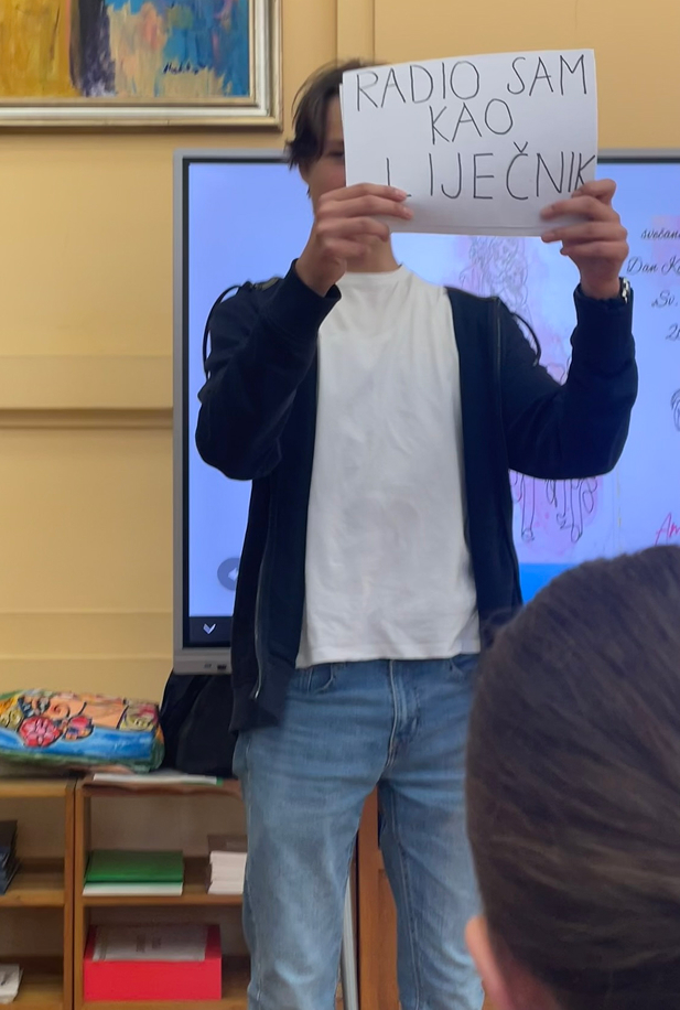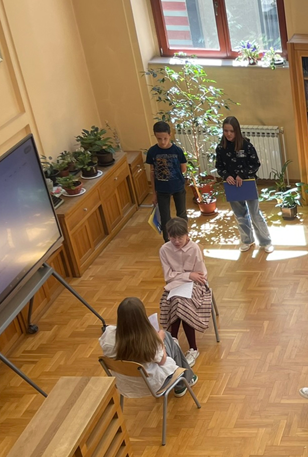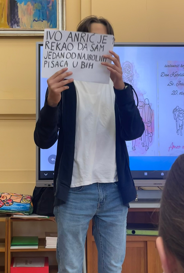Naravno da je idealno mjesto zbivanja bila školska knjižnica, pa je cijeli program počeo isječkom iz intervjua Ive Andrića čije ime i nosi naša knjižnica.
