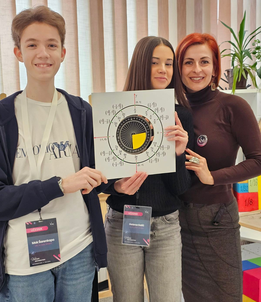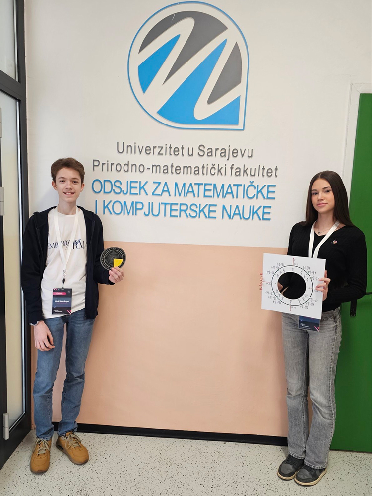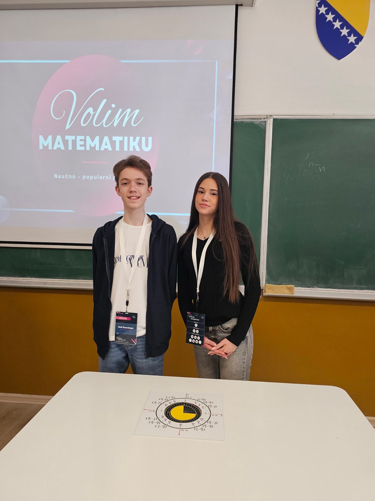 Dana 14. veljače, u prostorijama Prirodno-matematičkog fakulteta, održana je prezentacija matematičkih eksponata. Tim povodom učenici 9.c razreda naše škole, Helena Galić i Mak Šarenkapa, sudjelovali su na ovom skupu predstavljajući svoju temu/eksponat: „Mjerenje kutova stupnjevima i radijanima”.