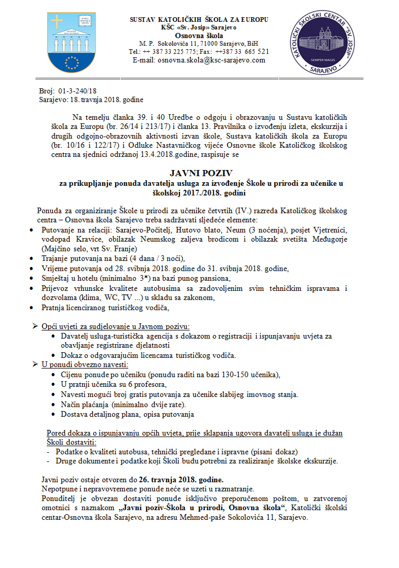 Javni poziv za prikupljanje ponuda davatelja usluga za izvođenje Škole u prirodi 2017./2018.