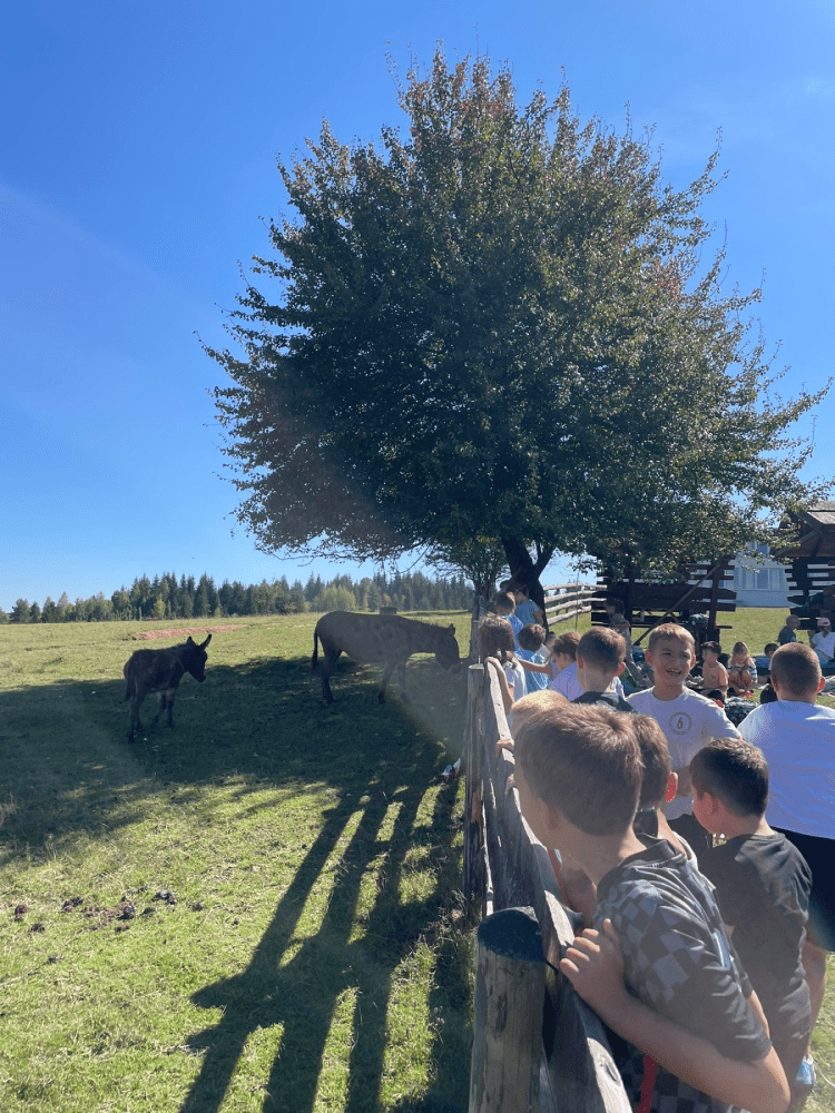 Po dolasku, dočekao nas je ukusan doručak koji su pripremili domaćini. Djeca su uživala u hrani, razmjenjujući uzbudljive priče o aktivnostima koje su ih čekale. Nakon doručka, započeli smo sportske aktivnosti. Djeca su se natjecala u nogometu, odbojci i raznim igrama s lopticama, a svaki uzvik oduševljenja dodatno je podizao atmosferu. Nakon sportskih igara, razgledali smo farmu i ZOO vrt. Djeca su bila fascinirana raznolikošću životinja i oduševljeno ih hranila, što je dodatno obogatilo njihov doživljaj. Ručak je bio još jedan divan trenutak; osim što smo uživali u ukusnoj hrani, okupili smo se i razgovarali o svemu što smo doživjeli, dijeleći smijeh i radost.