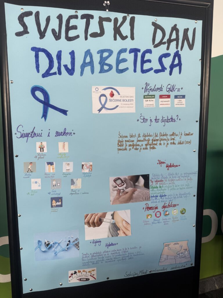 Povodom obilježavanja Svjetskog dana dijabetesa, 14. studenoga 2025. godine, učenici sekcije Mladi ambasadori sestrinstva, u pratnji profesorice Sandre Bogdanović, organizirali su edukativni program u školskom auditoriju s ciljem podizanja svijesti o važnosti prevencije i pravilnog života s dijabetesom.